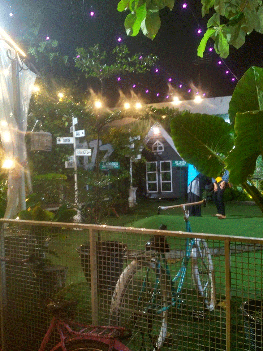 Sesuai namanya, cafe ini mengusung konsep taman terbuka dengan dekorasi menarik yang cocok untuk bersantai, berfoto, dan berkumpul bersama teman atau keluarga, terutama pada malam hari saat lampu-lampu taman menyala.